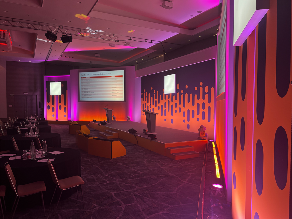 Our main room consisted of a huge, bespoke set fit with two 16:9 rear-projection screens – flanked and centred by stunning branded set panels & light boxes. A 12m x 3m stage was added to allow for panel sessions with larger groups of speakers & presenters. We also provided branded lecterns fit with podium microphones if presenters preferred this over a handheld or headset microphone.