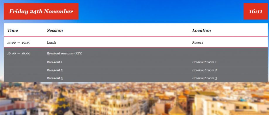 The timetable has many excellent features that ensure the delegates are going to the right place at the right time. The timetable updates automatically overnight which saves a lot of hassle in the busy conference mornings. It also clearly shows when a session is in progress by highlighting it grey. When a session has been and gone, the timetable automatically removes it from the queue of sessions, saving confusion.