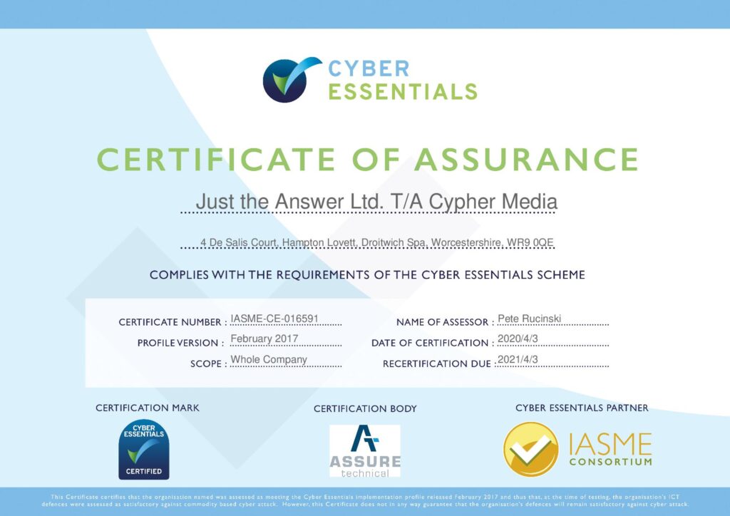 Cyber Essentials is a government scheme set up to ensure we have the correct policies and procedures in place to best protect itself from cyber threats, such as hacking and protection from malware. Cyber Essentials Certification is the confirmation that we have put in these policies and procedures to best protect ourselves. There are two levels of this certification, Cyber Essentials, and Cyber Essentials Plus. We intend to go for the plus in the very near future.