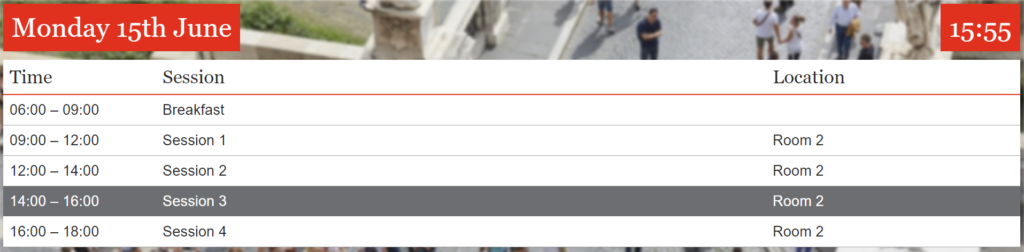 When we started this project, the goal was to create a networked timetable to display on digital screens which could also be remotely accessed and changed. When you’re at a large event, it’s inevitable that sessions will change, rooms will move, so our concept was to make the changes as streamlined as possible, while also eliminating the need to manually go around and update each screen accordingly. This flexibility is a big part of what makes our bespoke timetable system so special.