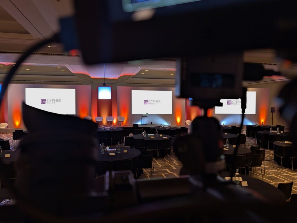 Video content was delivered across four rear projection screens powered by quad 8,000-lumen Panasonic projectors, controlled via Blackmagic Constellation matrix switching from main control. A two-camera livestream, combined with integrated live polling and Q&A, ensured remote audiences were fully engaged throughout the programme, helping to blur the lines between in-person and virtual attendance.
