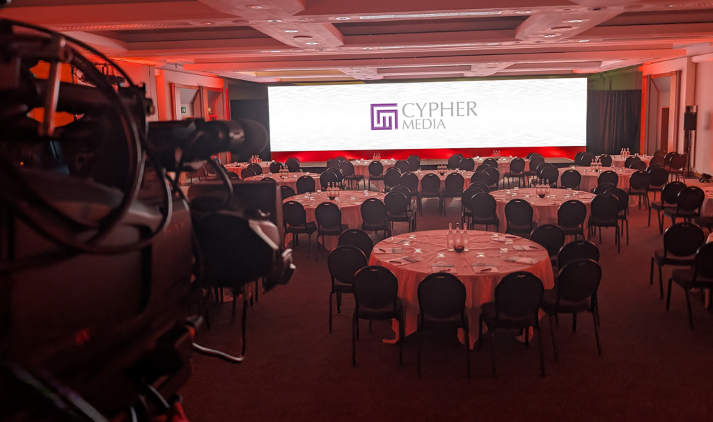 For the plenary room, our client opted for a beautiful super-wide 12m × 2.5m LED wall powered by a Barco E2 processor. The LED wall provided stunning visuals with a clean, minimal aesthetic. We also created a custom 12m × 600mm orange foamex riser surround to align with the client’s brand, while maintaining the refined, modern feel of the space.