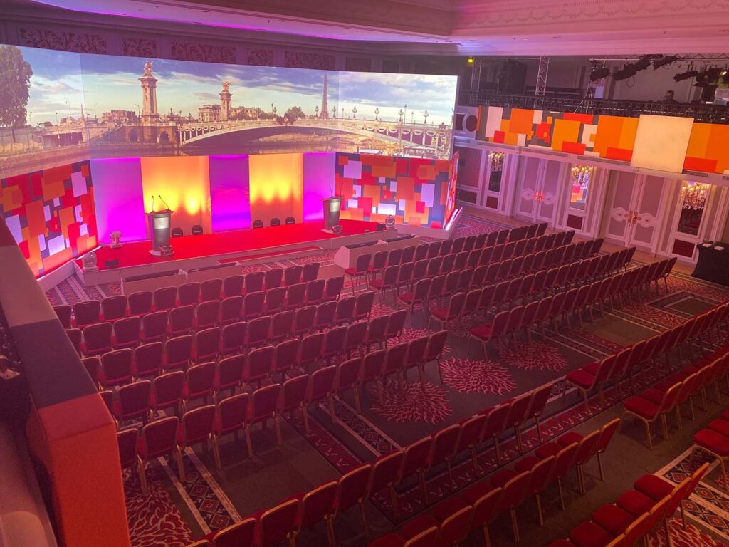 This event was a Global Tax Symposium being hosted in The Westin Paris – Vendôme. Over 350 delegates attended this event across a 2-day-period. Our team of 28 built a huge 48ft 3:2 ratio screen which was supported by 8ft panels, you can see our initial design & then the finished build below.