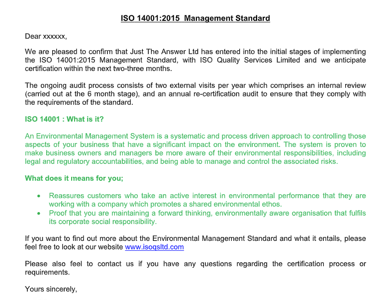 Following on from our ISO 14001 initial assessment earlier this week, we are aiming to be certificated before the end of March this year, so keep your eyes peeled for an update on our certification progress.